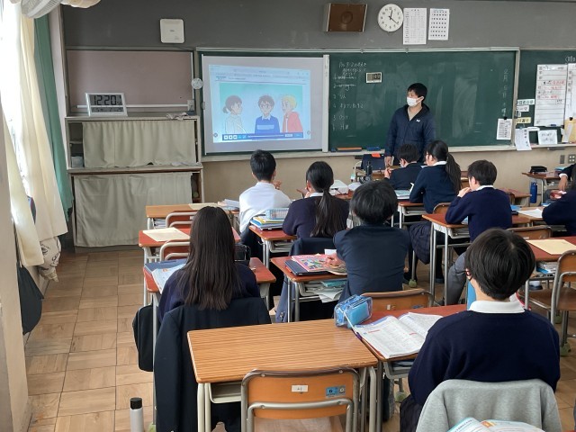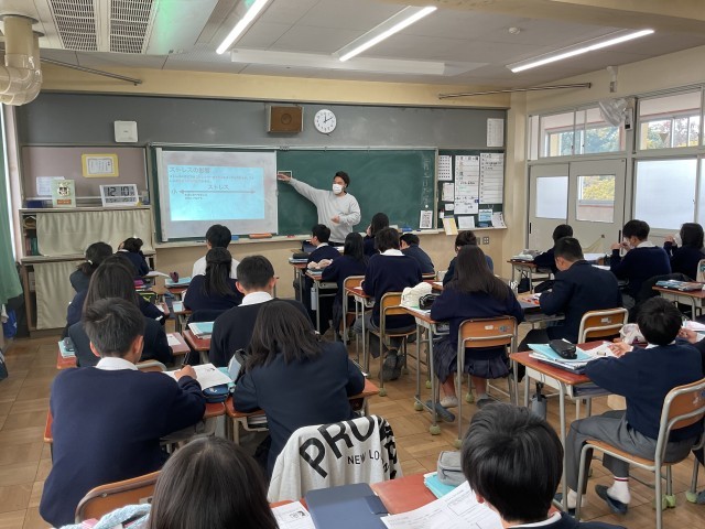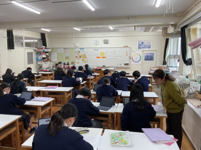 写真は、4時間目の1年生の授業風景です。保健体育の授業では「ストレスの影響や対処について」、英語の授業では単元「フィンランド名物はどんな味?」、美術の授業では「新商品のドリンクのパッケージをデザインする」ことについて、それぞれ勉強していました。