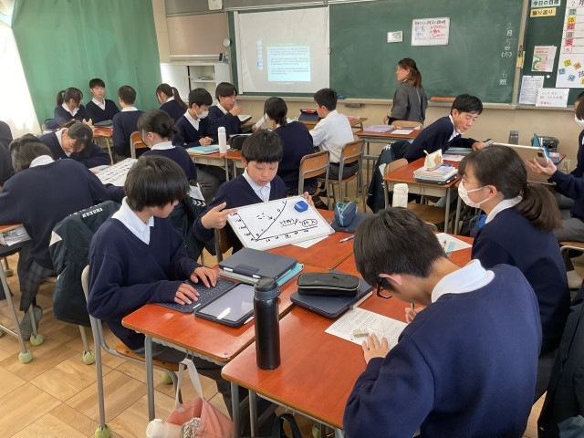 数学科の公開授業では、「事象に即して、グラフから必要な情報を読み取る」ことを目標にした一次関数の学習に取り組んでいました。写真は、「新しい駅までの運賃の決め方を考え、記述する」という課題に、グループで意見を交流している様子です。