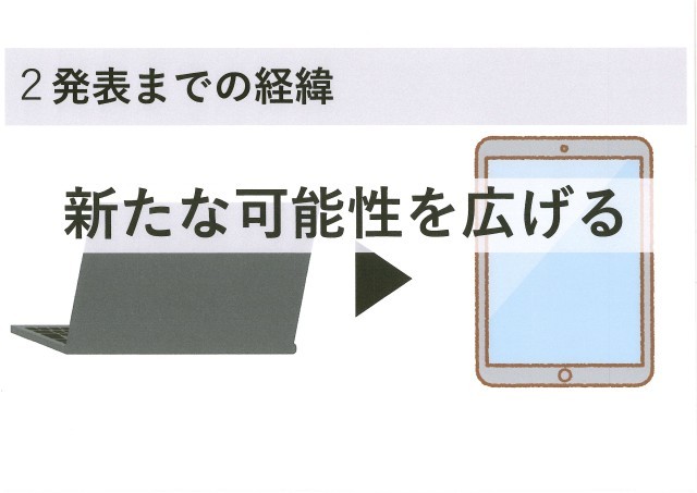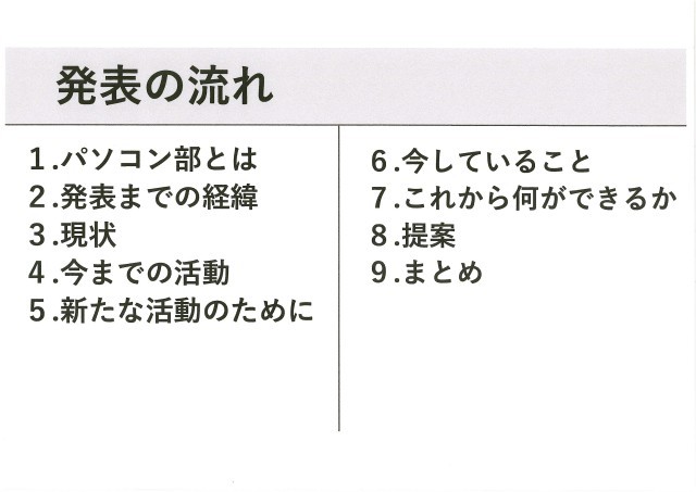 「パソコン部のこれから」というテーマで、ノート型パソコンからタブレットに移行する中で、どのようにして「新たな可能性を広げる」かについて、この半年間で取り組んできたことー3Dモデリングの作成・スクラッチによるプログラミング作成・デジタルカメラの活用などー発表してくれました。