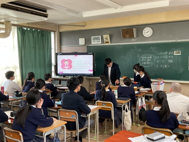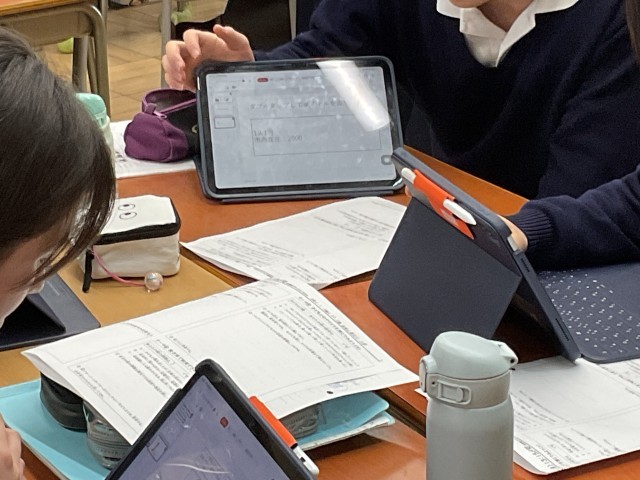 5時間目の3年生の授業。技術家庭科の保育の領域の勉強を行っていました。はじめに「子どもの誕生日に、1日遊ぶプランを考えよう」というテーマで班毎に調べてまとめた内容を順に発表してくれました。次のテーマは「枚方市で利用できる、子育て支援を調べよう」。班毎に相談しながらタブレットを使ってまとめ、作成後は席を移動して交流していました。