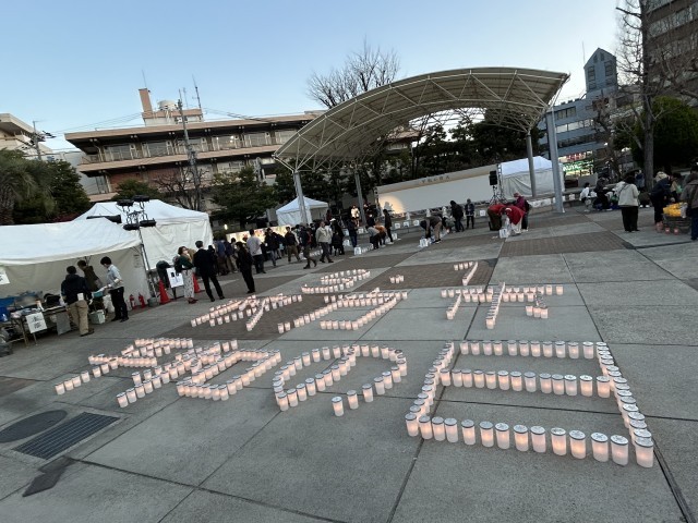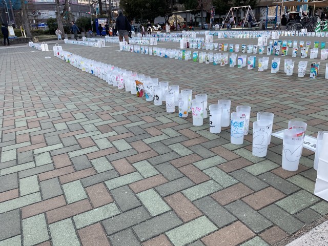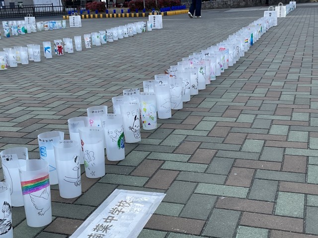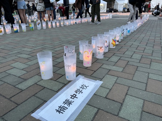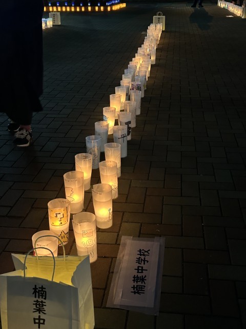 3月1日にニッペパーク岡東中央で開催された「平和の燈火」。本年度、楠葉中学校の2年生がキャンドルのカップに平和を願うメッセージを描いて会場に届けました。また、当日、本校の先生も点灯に参加し、生徒達の思いを伝えてくれました。