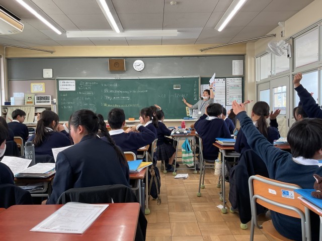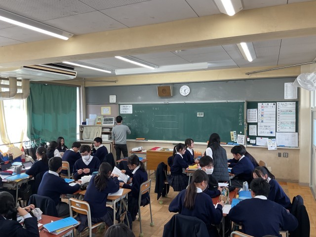 国語は、「意味と意図」の単元について、序論・本論・結論に分けて、書かれている内容を理解しようと班で話し合ったりしていました。英語は、過去進行形を見分けることをねらいとした授業が行われ、生徒達は元気に話し合いながら学習に取り組んでいました。