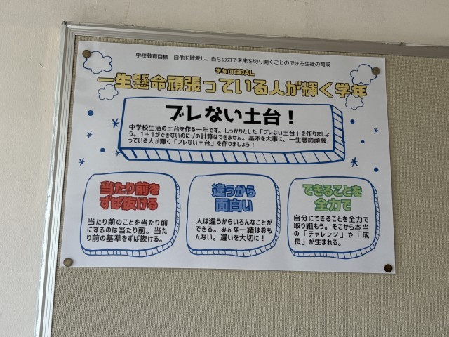 1年生では廊下に学年目標を掲示し、みんながいつでも見られるようにしています。