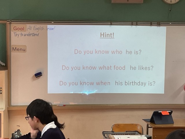 1月19日(月) Do you know who he is? 公開日 2026/01/19 更新日 2026/01/19 学校のようす 英語教室から賑やかな声が・・・3年生の英語の授業では「彼は誰でしょう?」という授業をしていました。紙に人物画とヒントを記載して、クイズ形式で答えてもらいます。楽しそうに授業に取り組んでいました。 +2 いいね(0)