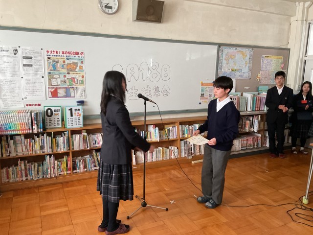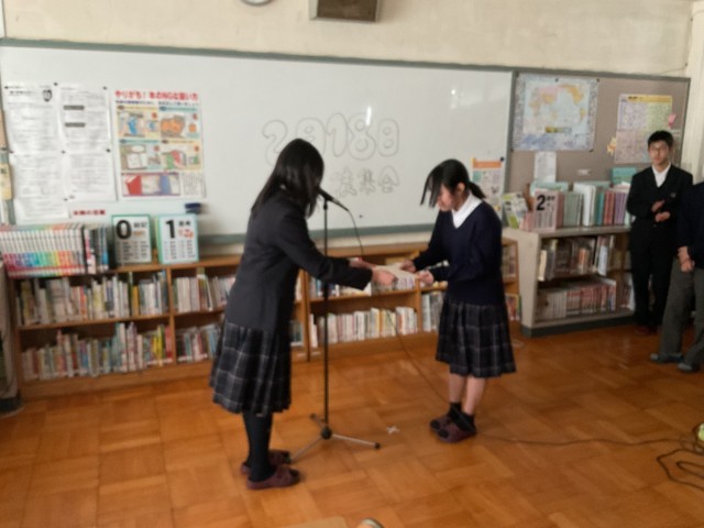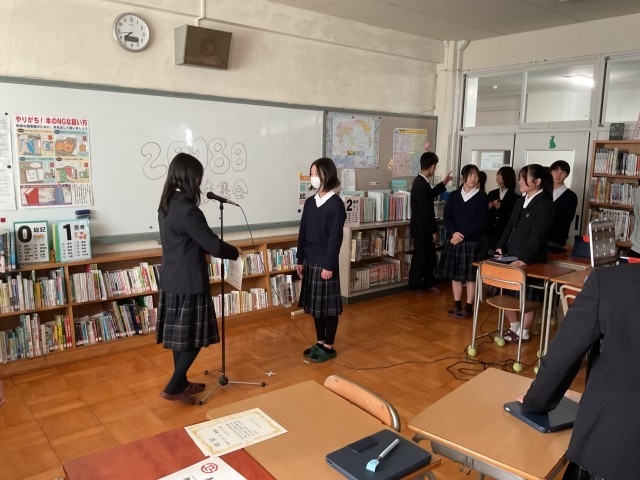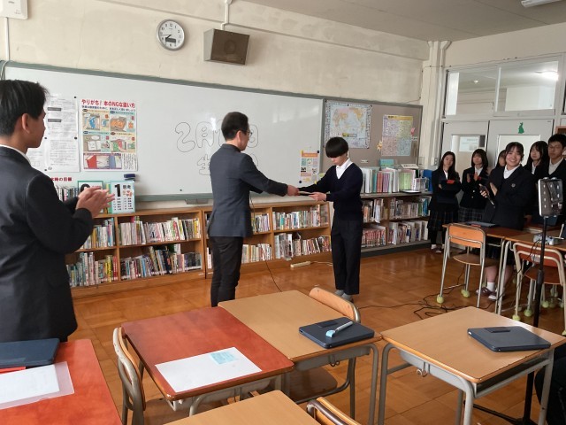 2月18日(水) 生徒集会 公開日 2026/02/18 更新日 2026/02/18 学校のようす 本日、生徒集会を行いました。内容は、 ・専門委員会の取り組み状況 ・美化コンクール表彰(1−1、2−2、3−4) ・部活動表彰(剣道部)インフルエンザ対策のため、リモートで行いました。若干のトラブルはありましたが、生徒会役員の生徒が臨機応変な対応で、無事に乗り切ることができました。素晴らしい、対応でしたよ。ありがとう。 +1 いいね(0)