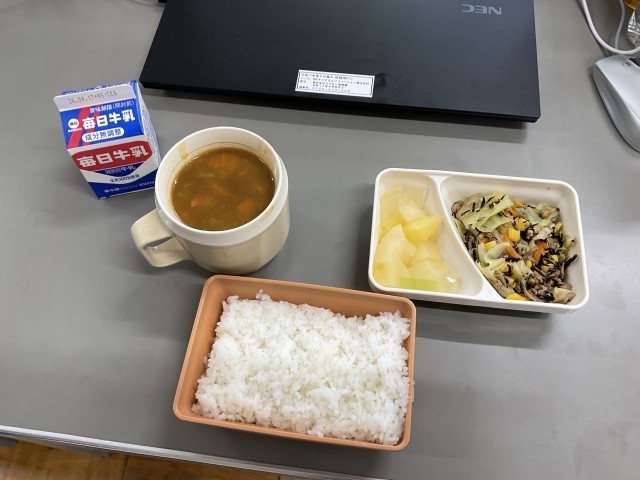 最初の給食は、みんな大好きカレーライスです。