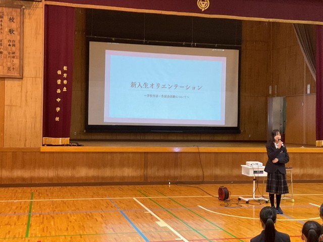 午後からはオリエンテーションが行われ、生徒会役員から学校ルールや部活動の説明がありました。