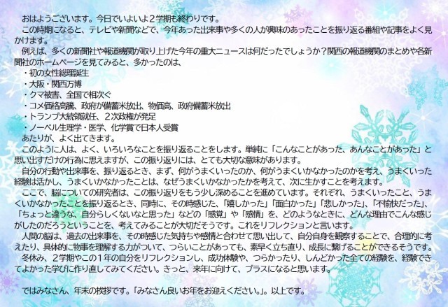 冬休み、生徒たちが事故無く、健康で年末年始を過ごし、元気な顔で始業式を迎えることのできますよう、各ご家庭におかれましても、ご指導、ご協力宜しくお願いいたします。
