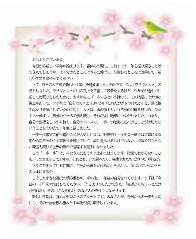 春休みも終わり、いよいよ新学期が始まりました。昨日、新入生を迎え、今日から全校生徒600名で令和8年度がスタートします。始業式では、全校生徒が静かに話を聞く中、校長からは、この1年、大切にしてほしいことについて話をしました。その後、新たに東香里中に赴任した教職員の紹介、新入生と2・3年生との対面式と続きました。対面式では在校生代表歓迎の言葉と新入生代表挨拶が行われましたが、東香里中の生徒は今年も大きな声での挨拶や、しっかり話に集中できる伝統を引き継いでいました。