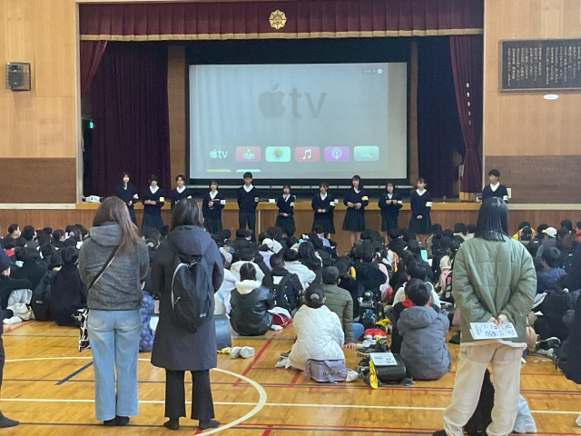 今日は、東香里中学校区の4つの小学校(春日小、香陽小、川越小、東香里小)の6年生が来校しました。この見学会は、中学校を見学し、春からの中学校生活を少しでもイメージできればという目的で例年行なっています。最初は体育館に集合し、生徒会役員の生徒たちから、中学校での1日の流れや生徒会活動、学校行事などについて話をした後、順番に各部活動を見学して行きました。クラブ見学はグランドも使用するので天候が心配でしたが、寒波の影響で大変寒い中とはいえ晴天に恵まれ、小学校の児童たちは熱心に説明を聞き、練習風景を見ていました。