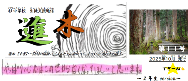 杉中学校で毎学期に実施予定としている「いじめ防止授業」を9月9日に実施しました。2年生も改めて「いじめの定義」や「いじめの四層構造」についてを確認し、「いじめの事例」から被害・加害・傍観者の立場になって自分で考え、ほかの人の意見を交流しました。それぞれの立場に立って、真剣に考える姿勢が振り返りワークシートから伝わりました。今の気持ちを忘れず、2年生なら杉中から…この世から…「いじめ」をなくせると感じました。