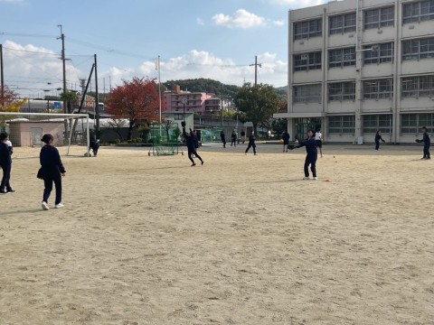 1年生はハンドボール、3年生は、ソフトボールとバスケットボールに取り組んでいます。いずれも球技ですが、ソフトボールは「ベースボール型」に、ハンドボールとバスケットボールは「ゴール型」にと、技能別に分類され、集団対集団で勝敗を競うことの楽しみや喜びを味わいます。