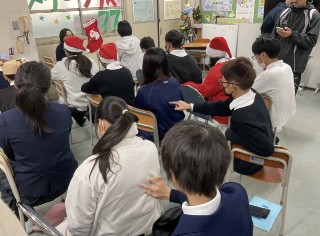 冒頭、教員のギター演奏に合わせて、クリスマスソングの合唱。