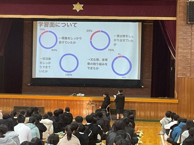 クラスごとの発表では、クラス目標や2学期の行事を振り返って、成果や課題が報告されました。