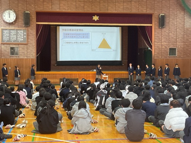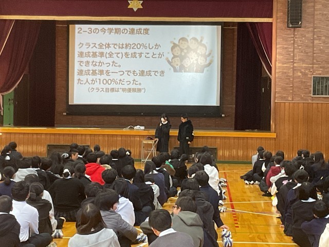 2限から4限にかけて、1年生から2年生、3年生と順番に見ていくと、明らかな成長の軌跡がうかがえます。2,3年生の今の姿は、現1・2年生の来年の姿と、期待が高まりました。3年生にとっては、学期末の学年集会は最後となり、残すは卒業式です。 中学校生活の残りを充実させ、悔いが残らないように、反省や課題はぜひ改善して、卒業式を迎えて欲しいものです。