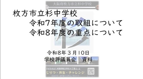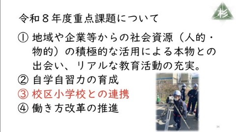 令和8年度の学校経営方針案にも、「次年度に向けた構想が実現されることを願う。」と後ろ盾をいただきました。いただいたご意見を生かし、より「誇れる学校づくり」に取り組んでまいります。