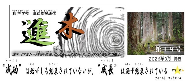 生徒指導通信「進木」No,19発行(3月24日) 公開日 2026/03/24 更新日 2026/03/24 学校の様子 生徒指導通信「進木」No,19を発行しました。 →通信は通信はこちら いいね(0)
