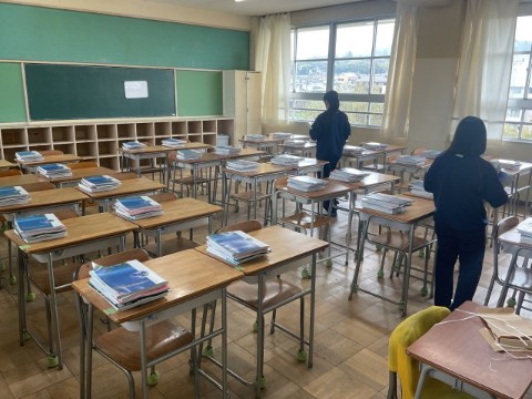 新3年生の半分が登校し、準備を進めています。