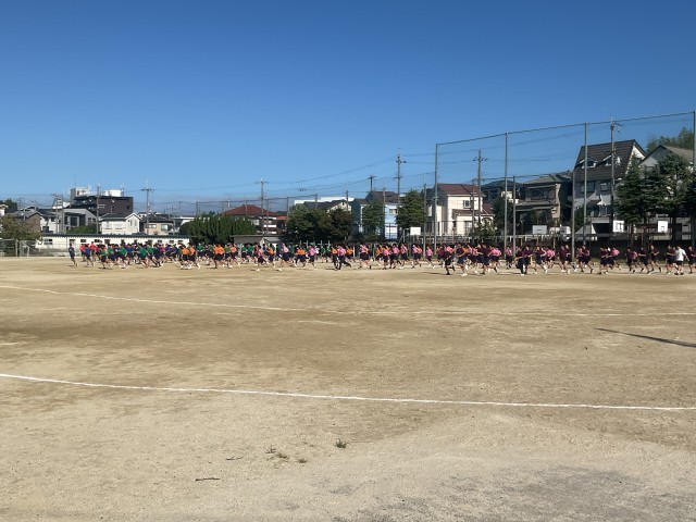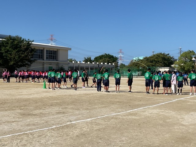 1年生の学年競技は、大縄跳びです。また、全員リレーもクラス対抗です。