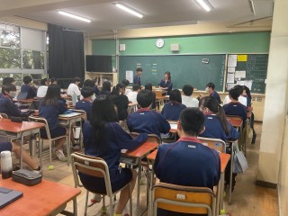 講師先生は、実際のスマートフォンの画面を提示しながら、アカウント設定の仕方や、実際の事件を引き合いに、危険性についてもお話をされます。場合によっては家族を巻き込んだり、自分の生活が変わってしまったりすることにも言及され、みな真剣な表情で聞き、中にはメモをとりながら聞く生徒もいました。