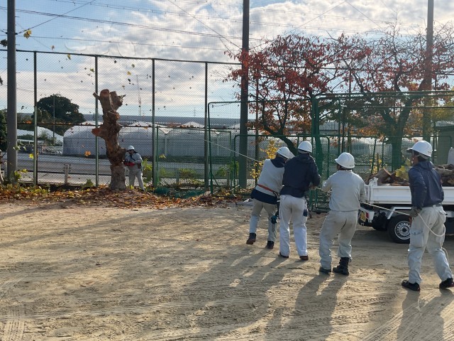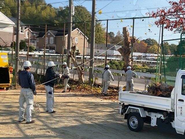 グラウンド沿いに植栽されている木の枝が、防球ネットを破って、道路にまで張り出すことから、特に影響のある2本を伐採していただきました。