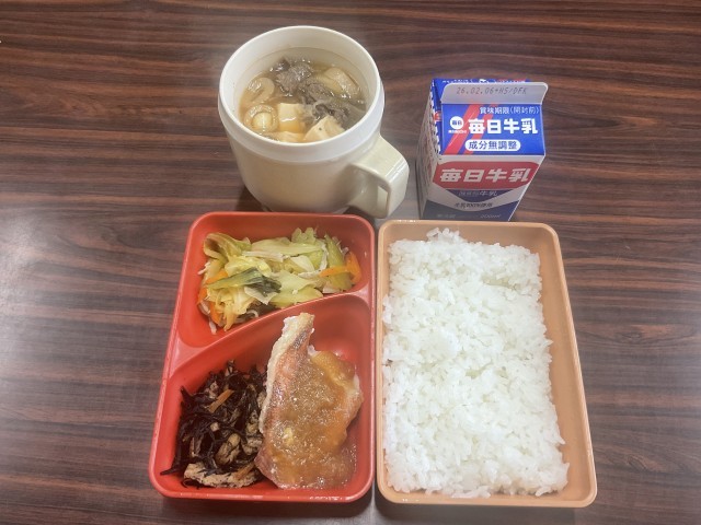 照り焼きハンバーグ、粉ふき芋、白菜の煮びたし、鮭の甘酒みそ汁、ご飯、牛乳