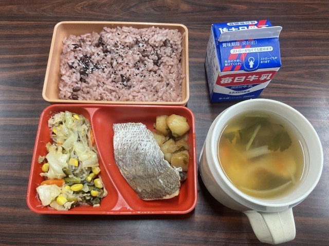 鯛の塩焼き、揚げじゃがいものねぎだれ、小松菜とツナの炒め物、お祝いすまし、ごま塩、赤飯、牛乳。