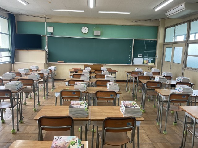 教室の机上には、真新しい教科書が積み上げられています。