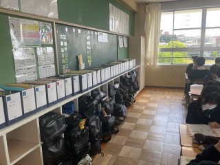 「教室の全面壁はできるだけすっきり、後方棚上・掲示物は整然と」を目指しています。