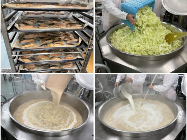鮭のタルタルソースがけ、エリンギの炒め物、キャベツの炒め煮、インゲン豆のクリームスープ、チーズパン