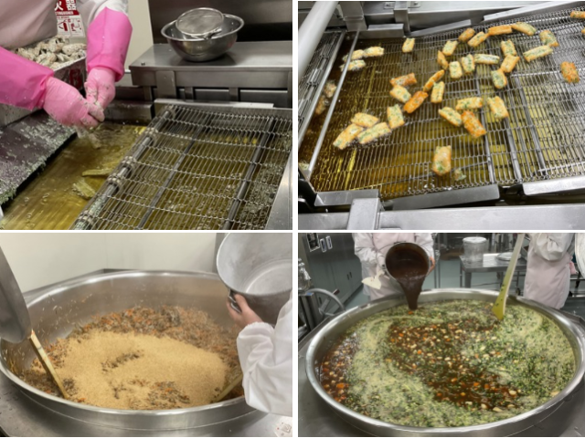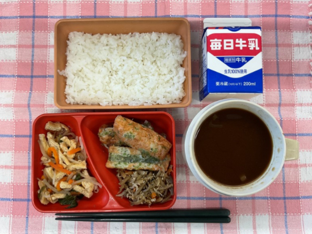 ちくわの磯辺揚げ、じゃこ入りきんぴら、チンゲン菜の煮びたし、赤だし