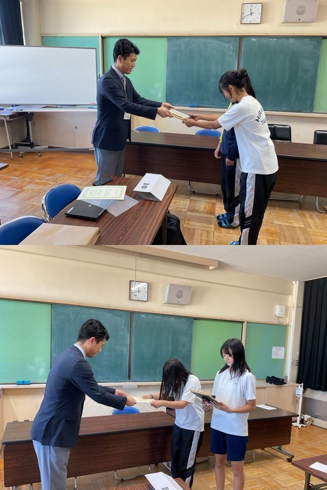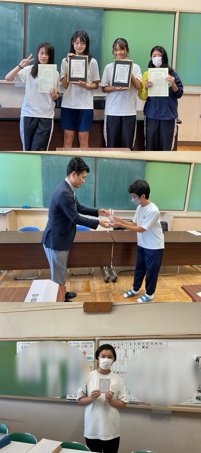 主催者の方がわざわざ東京から学校に来てくださり、生徒の代表に賞状や盾を授与してくださいました。