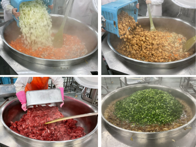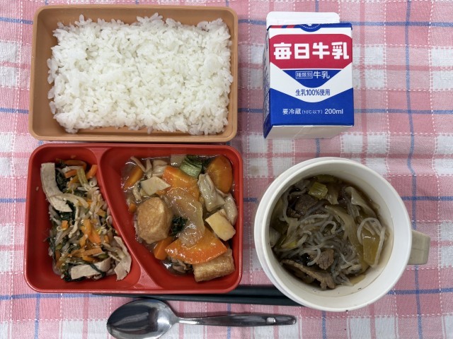 いかと厚揚げの野菜炒め、もやしのナムル、牛丼