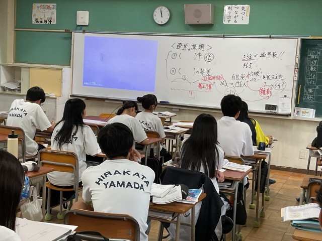3年生社会(公民)では、今の社会で起こっている事を例に挙げて学んでいました。