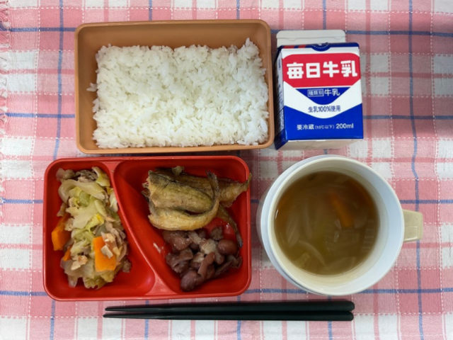 はたはたのから揚げ、金時豆、野菜炒め、団子のすまし汁、わかめふりかけ