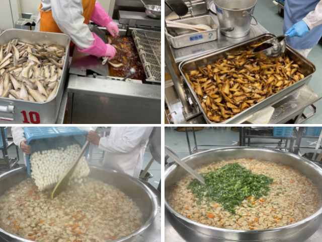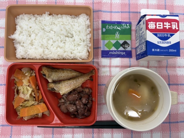 はたはたのから揚げ、金時豆、野菜炒め、団子のすまし汁、わかめふりかけ