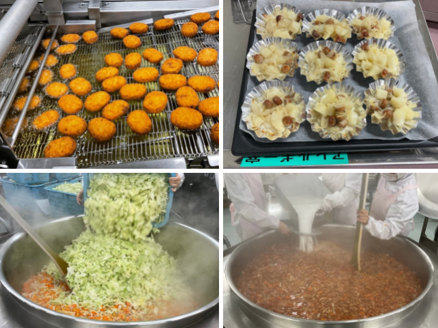 かぼちゃコロッケ、小松菜の炒め物、キャベツのガーリック炒め、ハッシュドポーク(米粉)