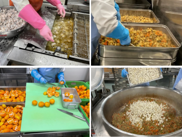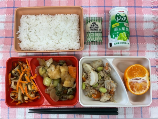 白身魚の野菜あんかけ、クーブイリチ、里芋のサラダ、みかん、ジョア