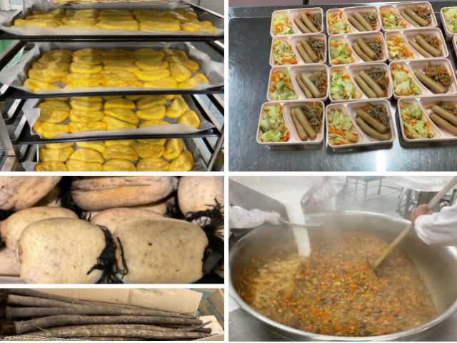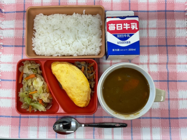オムレツ、ごぼうソテー、キャベツのソテー、冬野菜のカレー(米粉)