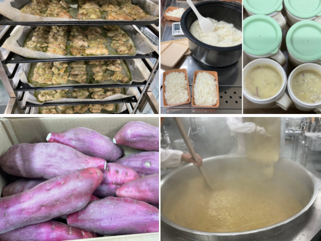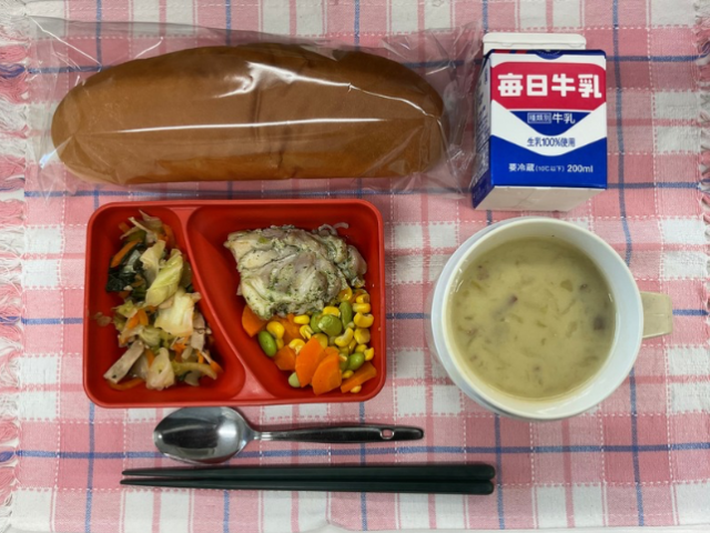 バジルチキン、コーンソテー、チンゲン菜のオイスターソース炒め、さつまいものクリームスープ、コッペパン