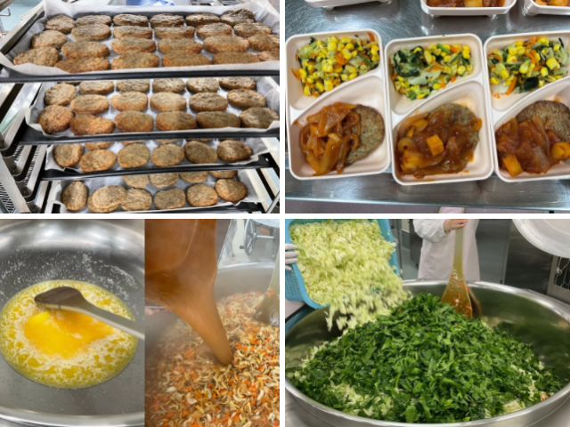 今日の給食のデミグラスハンバーグは新献立です。みなさんは、「デミグラスソース」がどういうものか、知っていますか?デミグラスソースとは、小麦粉やバター、肉、野菜などから作られる濃厚なソースのことです。そのコク深いソースを使って、野菜もごろごろ乗っているデミグラスハンバーグに仕上げました。