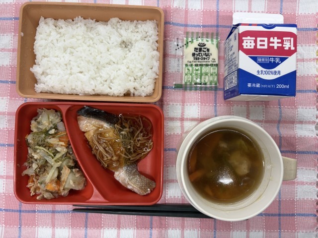 焼き魚(鮭)えのきソース、和風ポテトサラダ、鶏団子汁、ご飯、牛乳