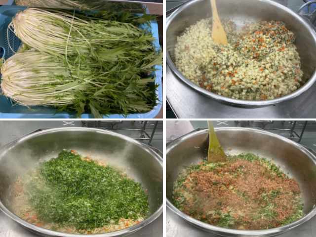 今日の給食の和風ポテトサラダは新献立です。いつものポテトサラダに、かつお節と水菜を加えて、和風味に仕上げました。ノンエッグマヨネーズと混ぜて食べてみてくださいね。