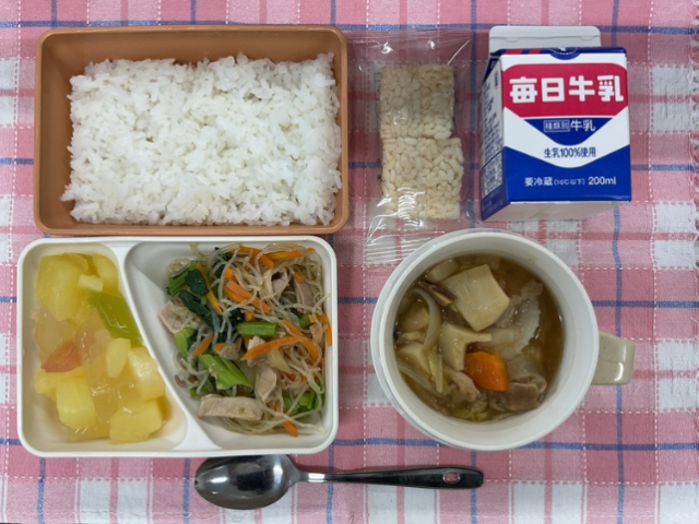 八宝菜(うずら卵)、春雨の炒め物、フルーツポンチ、おこげ