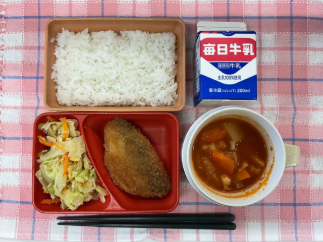 アジフライ(米粉)、ささみとキャベツのソテー、ミネストローネ