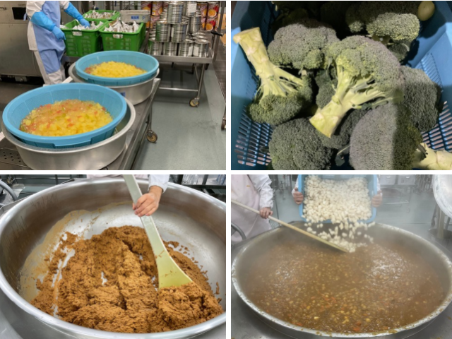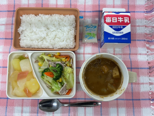 冬野菜のカレー、ブロッコリーのサラダ、フルーツポンチ