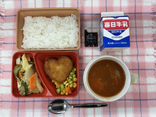 2月14日は、バレンタインデーです。それにちなんで、今日のコロッケはハート型になっています。バレンタインデーといえば、女性から男性へチョコレートを贈り、告白をする日として親しまれているイベントですが、この風習は日本独自の文化で、アメリカや他の国ではあまり行われていないそうです。意外ですね。(栄養教諭より)