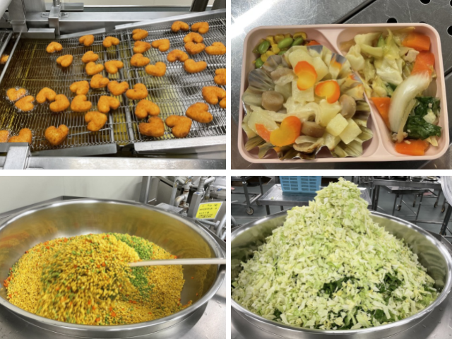 ハートコロッケ、コロコロソテー、キャベツのガーリック炒め、ハッシュドポーク(米粉)
