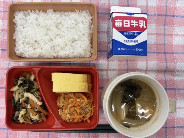 厚焼き卵、人参シリシリ、小松菜の煮びたし、わかめのみそ汁、ご飯、牛乳
