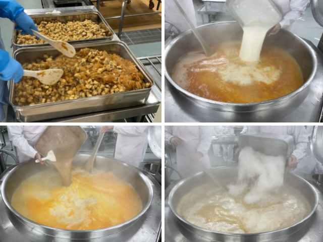 今日の豆乳ごま入り担々春雨は、新献立です。豆乳とねりごまを使った、濃厚な担々麺のスープをベースにした春雨スープです。豆板醤も少し入っているので、濃厚なコクの中にもピリッとした辛みも感じられると思います。